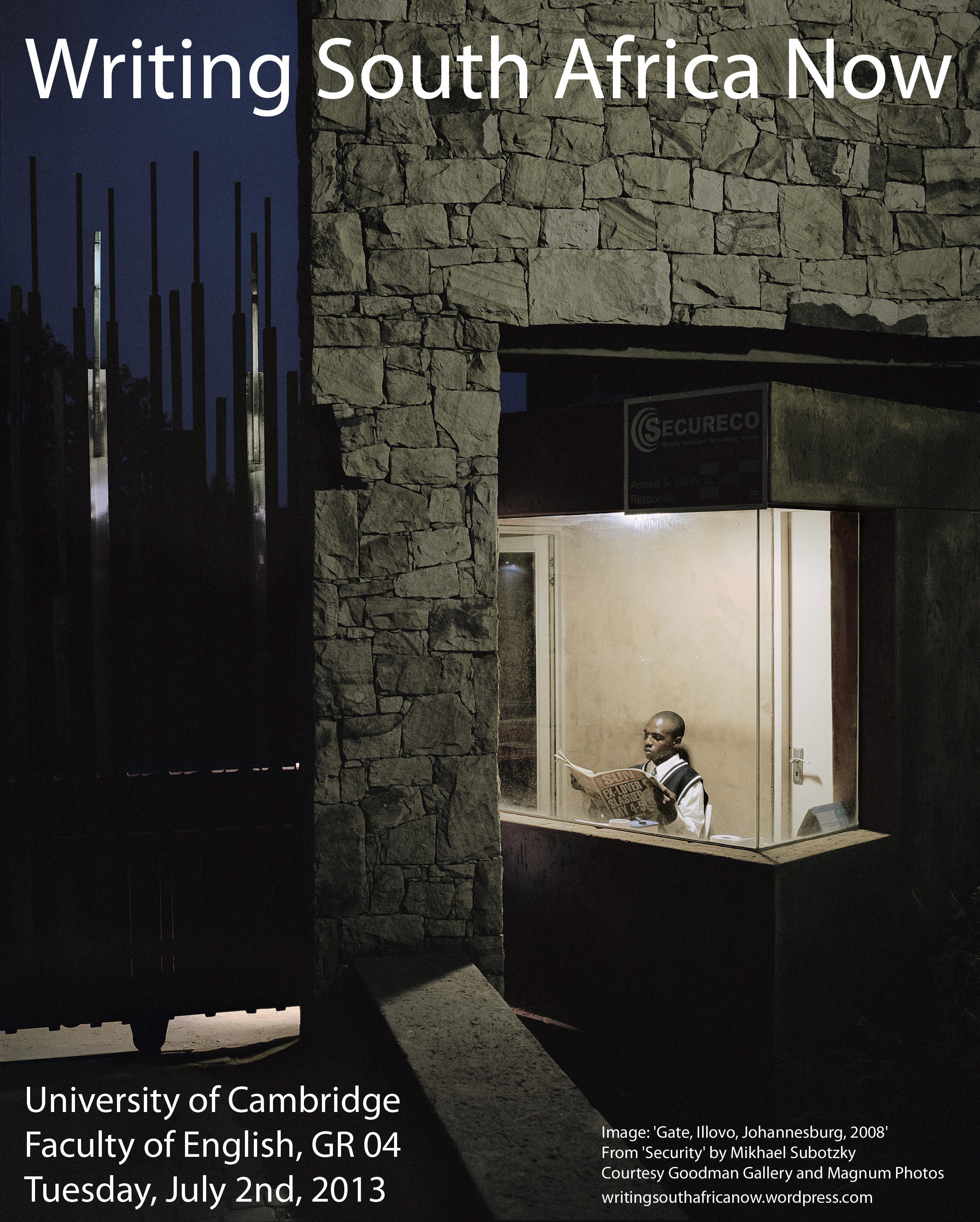 *Writing South Africa Now* is a new collective of research students and scholars based in the English Faculty at the University of Cambridge. It is committed to the literary critical study of South Africa in the broadest of terms, with interests ranging widely from the contemporary novel, the short story, and creative non-fiction, through to oral history narratives, testimonial theatre, and documentary film. Motivated by an ambition to make new critical voices from within the UK heard, *Writing South Africa Now* is delighted to invite you to its inaugural colloquium to be held in Cambridge on Tuesday, July 2nd 2013.