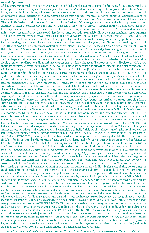 Publishing an excerpt from Kombuis’ bilious ‘unpublished one-sentence novel written in a fit of depression […] in the winter of 2012’ in tightly-packed, crotchety nine-point print was inspired. Hedley Twidle’s playfully Oulipian ‘N2’ is a psychogeographical ‘non-travelogue’, an ‘anti-travel guide’ to a highway, punctuated by textual lay-bys and pee-breaks, ludic digressions and meanders. Everything is printed on a sensuous, textured, off-white paper that provokes in me an urge to loiter and thumb, to mooch by the book-racks.