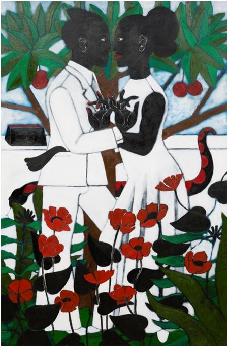 Odedina describes himself as a folk artist and his practice is inspired by the rich figurative and oral traditions of African art, infused with a trace of magic realism. The legibility of his allegorical vernacular, warmly hailed as ‘Brixton Baroque’, is paramount. His work is operatic and mythical whilst intimate and accessible. Odedina references objects and symbols from a global glossary and activates them with timeless, relatable characters – magicians like Professor Peller, goddesses like Mami Wata and Pomba Gira, young passionate lovers – to engage us in a conversation filled with personal and universal references that summon a sense of camaraderie. ‘The struggle is to reconcile bold imagery with ideas about ambiguity or indeterminacy. My intention is to arouse the imagination and heart of the viewer and to detonate ideas in another realm’.