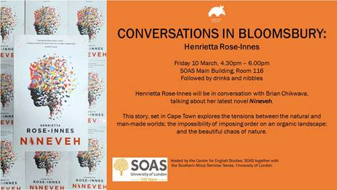 Hosted by the Centre for English Studies, SOAS, together with the Southern Africa Seminar Series, University of London, the next edition of the Conversations in Bloomsbury events will stage two Caine Prize recipients in conversation—Henrietta Rose-Innes and Brian Chikwava.