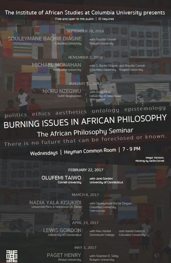 Burning Issues in African Philosophy is curated by Drucilla Cornell and Souleymane Bachir Diagne and presented by the Insitute of African Studies at Columbia University. It includes six seminars with Souleymane Bachir Diagne, Michael Monahan, Nkiru Nzegwu, Olufemi Taiwo, Nadia Yala Kisukidi, Lewis Gordon and Paget Henry.