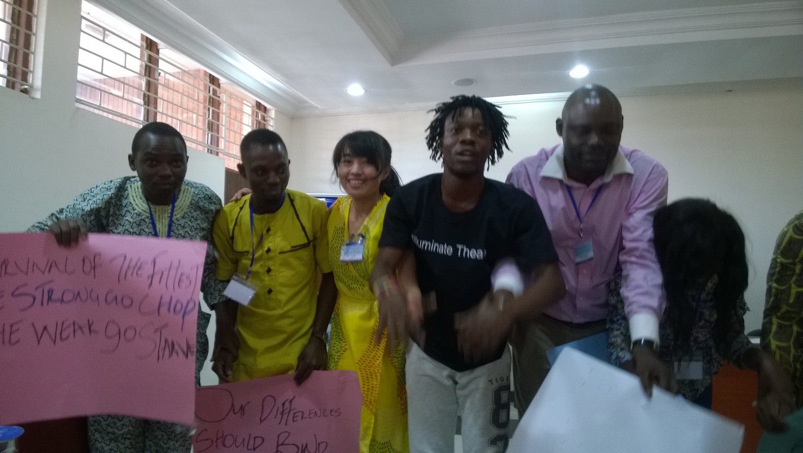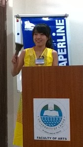 The second conference of the Lagos Studies Association has just taken place, at the University of Lagos. The conference had many memorable moments, but the one that stands out for me was when the panel was interrupted and punctuated by a performance. The panel, called “Nollywood and Theatre: Expressive Culture and Performance on Stage and on Screen” followed the pattern well known at academic conferences: panellists sat at the high table, and took turns to talk about their research, after which the audience would get to ask questions. Dr Ying Cheng of Peking University broke with convention by standing up and leaving the high table, and started ringing a large hand bell. After what felt like several minutes when we in the audience were not quite sure what to expect, the door opened and three performers from Illuminate Theatre entered the conference room.