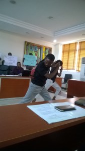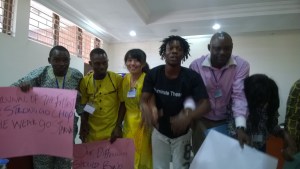 The paper Dr Cheng had presented was called “Mi Ò Ní Choice: Performing the Arts of Citizenship in Lagos”.  The linked performance was a commentary on and archive of Occupy Nigeria, and the performers had prepared a series of large A2 size pieces of paper with slogans and words written on them (for example SURVIVAL OF THE FITTEST. THE STRONG GO CHOP THE WEAK GO STARVE).  One of the performers started taping these to the wall, when a Professor from the University of Lagos Theatre Arts Department (Prof Cornelius Onyekaba) decided to join the performance, and soon each placard was held by a line of academics who thus became participants in the performance piece. Prof Onyekaba intervened because there was limited time, but he also understood clearly that the performance required of the audience to arrest the passivity of our bodies, and to imagine worlds of activism and engagement that went beyond the conference venue. The performers remained in the room for question time, sitting on a row of chairs to the side of the room, nodding or shaking their heads to the rest of the presentations.