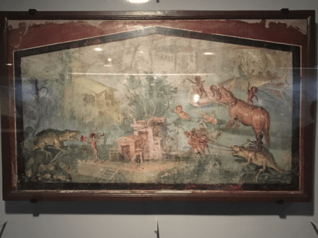 An example of these converging networks of circulation is seen in the display of a fresco from the 1st century A.D. uncovered in Pompeii, featuring a group of Pygmies hunting and fighting crocodiles and a hippopotamus. The fresco demonstrates how ancient Greeks and Romans were inspired by ideas of Africa through a past of shared cultural as well as economic exchange and contact. The accurate depiction of wildlife specific to Sub-Saharan and central regions of Africa helps one to understand the vast social connections already established by this early period, well beyond the North African coast. Indeed, communities across the continent are as culturally and socially productive as the Greek and Roman civilizations during their respective eras. This is validated in the exhibit’s presentation of a decorative rock sculpture featuring a giraffe discovered in southern Algeria dating between 6200-2200 B.C., a Nubian engraving thought to represent religious, administrative, and political value all at once from 1550-1070 B.C., or an ornamental vase from Ethiopia believed to be crafted in 320 B.C.