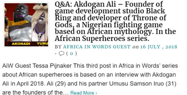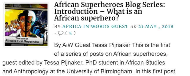 Read the African Superheroes series back and forth across AiW via the previous post, the first –