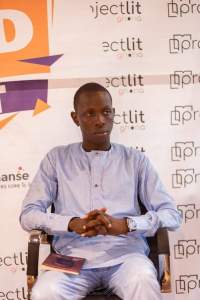 Femi Morgan reading at a Praxis Hangout event, c. of AiW Guest Author, Tọ́pẹ́ Salaudeen-Adégòkè.