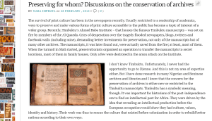 The breadth of knowledge and conservation dilemmas experienced at Timbuktu in the development of the Manuscript Project founds a unique archival model, Rasool concludes. It is one of “preservation and partnerships…founded on the capacities and commitment of citizens”, working with a “notion of conservation, not as an infrastructural or technical issue, but as a social question”. Improta closes by taking this up via a reflection on Professor Patrick Ngulube‘s work on preservation in African Institutions and the importance of prioritising “local technical demands” in archival practice. For Improta, the choice of how we archive is one that must be centred by the people who will make use of the archives, a call, then, not just for indigenous knowledge bases in creating new archival practices but a wider opening of the archive’s doors that can extend a welcome that goes beyond the ‘specialist’, or ‘expertise’…
