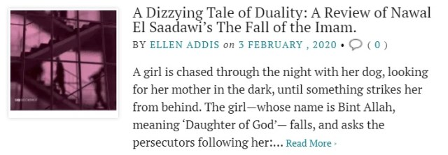 Ellen closes her review of this novel by bringing the two female protagonists of both The Fall of the Imam and Two Women in One together in their fight against silencing and the possibilities of the imagination as offering other ways of being heard, citing El Saadawi in an interview for The Cairo Review, that “all creative works help to open the minds and illuminate oppressed women and men”.