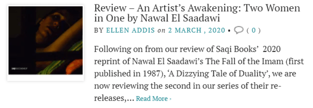 Ellen’s review of El Saadawi’sTwo Women in One, ‘An Artist’s Awakening’, can be found here.