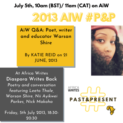 AiW Note: this republication of a 2013 in-depth (long) and rich (vibrantly so) conversation between poet and activist Warsan Shire and Katie Reid of AiW marks the first post in our second day of Africa Writes #Past&Present revisits over this weekend in July, the weekend that Africa Writes go-ers are usually descending on, in, and around the British Library for the Royal African Society’s annual literary festival. Our schedule of re-posts, designed to simulate the feel of going between panels, interviews, headline events, and the books fair – at least in some small way, can be found here in full: Back to Africa Writes – AiW’s #Past&Present.