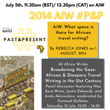 Perhaps I’m biased because I’ve just finished researching a doctorate on the literary history of Nigerian travel writing, but it seems to me there is a growing buzz about travel writing by Africans. Interest in the genre often centres on growing African self-representation through travel writing, and the possibilities of reclaiming a genre which can be seen as inherently tainted, colonial in origin and with a tendency towards the worst kinds of stereotyping. This sense of travel writing’s potential for ‘telling our own stories’ was implicit in the panel’s title: ‘Broadening the Gaze: African and Diaspora Travel Writing in the 21st century’, which pointed to the need to reclaim the ‘gaze’ that is central to travel writing’s rhetoric and which has tended to offer white and Western perspectives on the world. But travel writing also interests me because contemporary travel writers often do interesting things with form, the internet and self-publishing, and in this sense are part of the boundary-pushing that we heard about elsewhere at the Africa Writes festival, whether in the form of Afro-futurism, writing ‘beyond the novel’, genre fiction, or the ‘literary crossdressing’ of genre-bending writers.