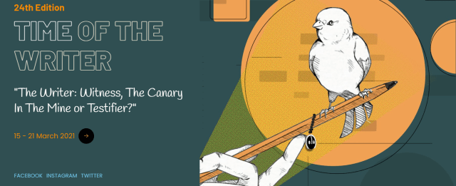 In this 24th year of Time of the Writer Festival as we face a global pandemic for the second year, it seemed important that as I looked at the larger festival theme The Writer: Witness, Canary in the Mine or Testifier, I focus too on the writer’s voice in a political, social and artistically-conscious world. I focus on this because it’s the world we live in. For what is writing, without politics or society, and how meaningful is it if not executed artistically?