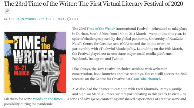 #Past – AiW’s Time of the Writer 2020 coverage, inc. Q&As with Fred Khumalo, Remy Ngamjie and Siphiwo Mahala.