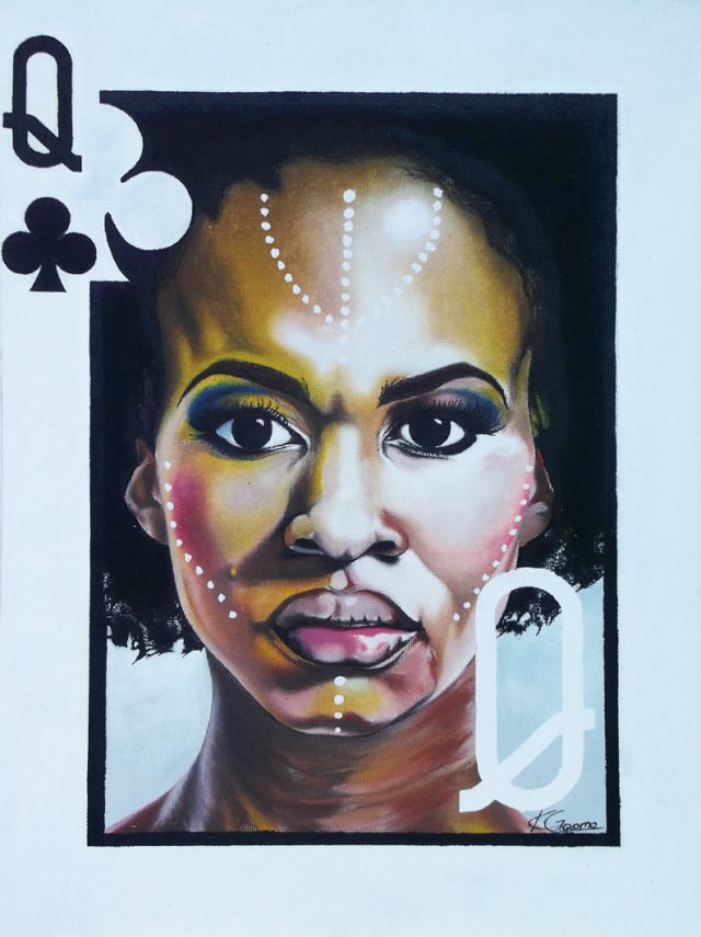 Like you, I look for interesting characters, and yet unlike you, I look not only from my immediate surroundings but from everywhere, online, from magazines, and from other materials I chance across. Since I have just discovered my new style of working after I looked at Willie Bester and Nelson Makamo for inspiration, I don’t paint or sculpt like they do but work to be significant to the times we live in. I pixelate the images in multiple colourfully controlled beadwork arrangements because I want to celebrate the existence of beauty by means of exaggeration and colour.