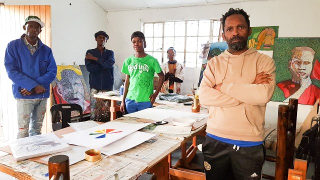 New Brighton Art School Mentorship group, from left, Khaya Gqomo, Madoda Honi, Ayolile Holweni, Phulile David Rawana and Dolla Sapeta. 2021.