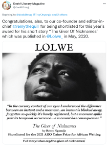 This year’s (2021) shortlist included Ugandan Doreen Baingana who has been shortlisted for the Caine twice before (2004 and 2005, both times with stories from her collection Tropical Fish), and Rémy Ngamije (Rwanda/Namibia) and Meron Hadero (US/Ethiopia), who both made their second shortlist this year, having previously been shortlisted in 2020 and 2019 respectively. Both Ngamije and Kenyan writer Troy Onyango (shortlisted for the first time this year) head two of the leading literary magazines on the continent — Doek! in Namibia, and Lolwe in Kenya, respectively. Their contribution to contemporary African literature is both through their craft and their work in providing literary platforms for other creative writers.