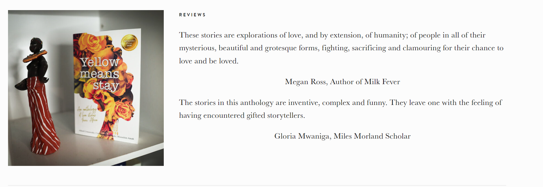Yellow Means Stay features 21 stories, including by writers who have gone on to feature in prestigious and prominent awards for contemporary African literature: