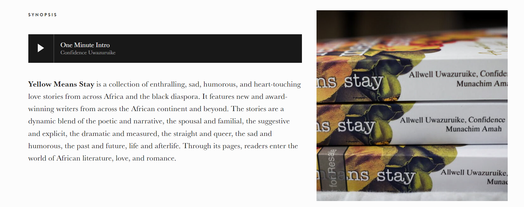 “Yellow Means Stay is a collection of enthralling, sad, humorous, and heart-touching love stories from across Africa and the black diaspora. It features new and award-winning writers from across the African continent and beyond. The stories are a dynamic blend of the poetic and narrative, the spousal and familial, the suggestive and explicit, the dramatic and measured, the straight and queer, the sad and humorous, the past and future, life and afterlife. Through its pages, readers enter the world of African literature, love, and romance.”