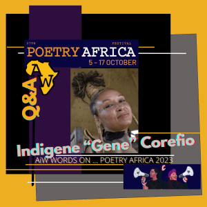 And Indigene GENE Corefio shared some details of her performance in the sell-out Poetry Africa event on the 7th October, the last night of the Johannesburg leg of this year’s Festival, before it moved down to UKZN at Durban, pre- the Bloemfontein run on the 16th-17th.