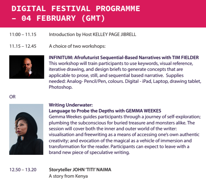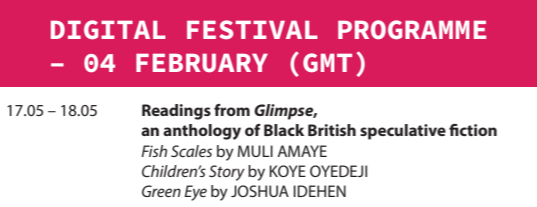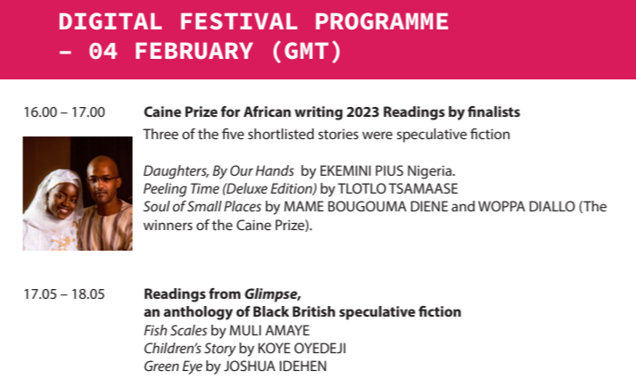 Because the in-person Festival — 3 days celebrating African and African diasporic spec fic writing — is London-based, organisers are running a Digital day-long edition on the Sunday 4th Feb, with priority bookings for people who cannot attend in-person due to distance or disability.
