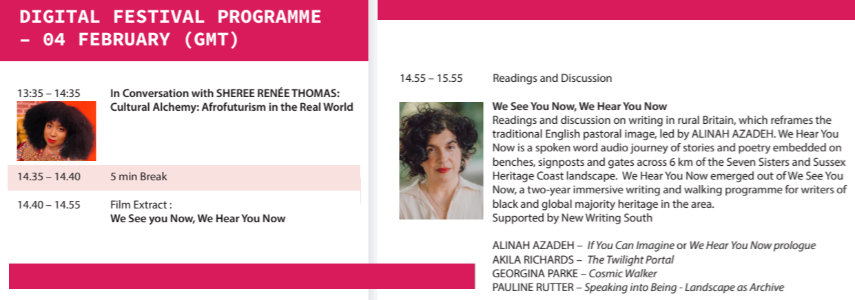 Prefacing the We See You Now, We Hear You Now session is the digital festival headliner conversation, with Sheree Renée Thomas, ‘Cultural Alchemy: Afrofuturism in the Real World’ (13.35-14.35).