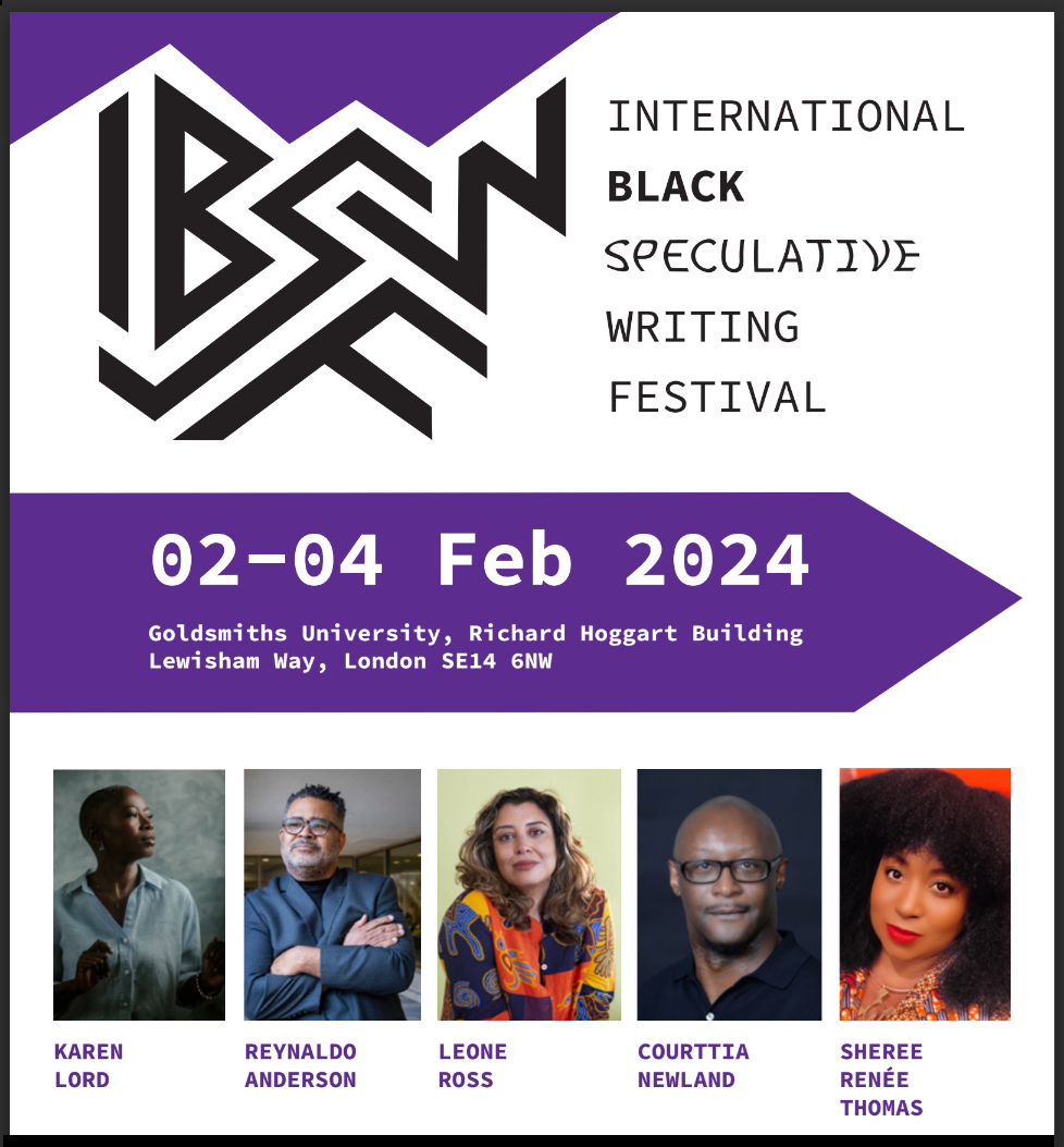 Just under a week to go, with the last chance saloon doors swinging, we are dipping in to our archives: this AiW #PastAndPresent post may look back but has our sights set firmly forward to the Digital Festival Day (04 Feb) of the inaugural International Black Speculative Writing Festival weekender –– at Goldsmiths University in London, from the 2nd – 4th Feb 2024.
