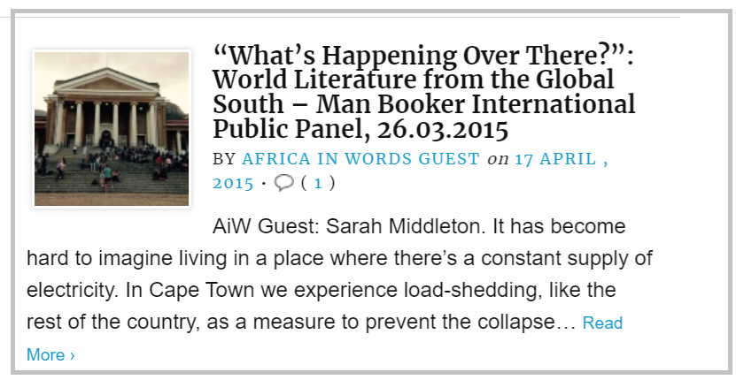 Sharing a geographical setting that critically reflects on the Cape Town that each of their AiW pieces are involved with, between them, Charlotte and Sarah’s posts open questions about the spaces of ‘world literature’ being dependent on who is defining the ‘wordliness’ and the ‘literary’, and from where…