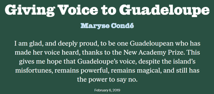 “On December 9, 2018, I received the New Academy Prize for literature in Stockholm, Sweden, the award set up last year to replace the Nobel Prize, which was canceled after a scandal and dispute at the Swedish Academy. It was the second time a writer from Guadeloupe had been awarded a prize of such importance. In 1960, the poet Alexis Léger, known as Saint-John Perse, was awarded the Nobel. You could not imagine a more perfect contrast: he the descendant of the proud caste of békés, white Creoles, settled on the island since the eighteenth century; myself the descendant of African slaves who crossed the Atlantic loaded like animals in the belly of the slave ships… Read More> from Condé in the New York Review of Books (2019)