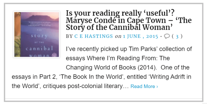 Although Sarah’s post doesn’t discuss Condé’s work directly, there are overlaps in the questions that Charlotte’s piece raises — itself less of a traditional review and more of an exploration of the novel’s situation in an emergent value discourse about ‘world literature’ in creative writing and literary studies — questions that go beyond Cape Town as the setting for L’Histoire de la Femme Cannibale / The Story of the Cannibal Woman.