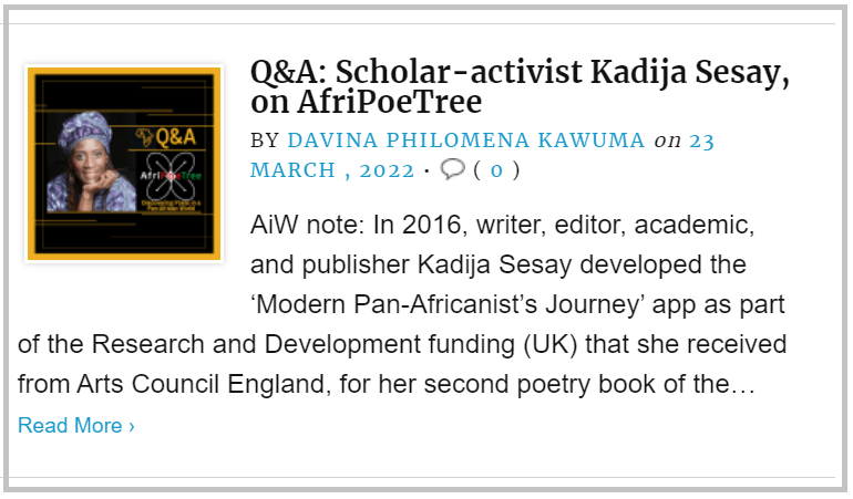 These, and all the questions that come up in these readings, are set into a lively conversation between the posts (do two couplets make a quatrain? Is what we have here, with the late addition of a previous P&P, pentametric? Literature and poetry geeks: rejoice!). And all positioned in the dynamics of legitimacy of the ‘worldly’ status of African authors conferred from over where?…