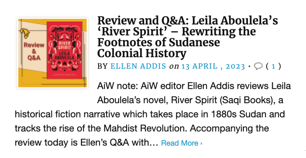 Part of a longer review post by AiW editor Ellen Addis, Aboulela’s mention of Segu — arguably Condé’s most widely read novel — comes in their discussion of River Spirit and historical fiction, picking up on the review’s clarity in pinpointing the ways that River Spirit “rewrites the footnotes of history”, filling “gaps and omissions through creative imagining” of the historical narrative which takes place in 1880s Sudan. Re-tracking the rise of the Mahdist Revolution in the process, a context the review summarises in brief as follows: