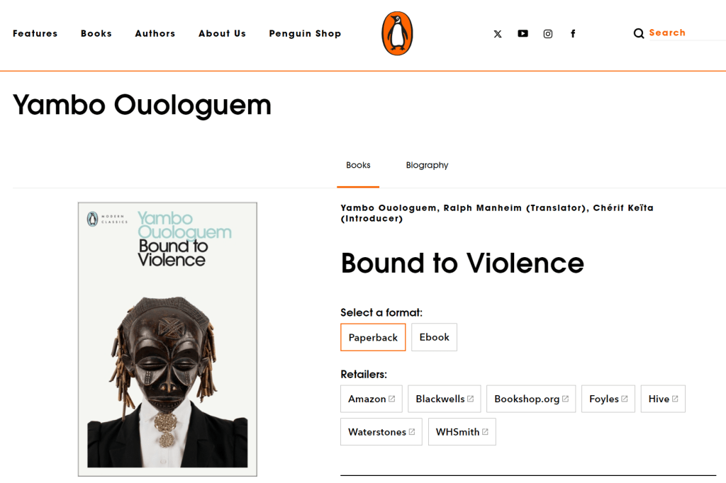 Yambo Ouologuem’s Bound to Violence, a Penguin Modern Classic (2024), is available at Penguin Books UK website (penguin.co.uk), on the image link below, where you can also read Chérif Keïta‘s Foreword, ‘Tracking the Trickster in Mali’ via the ‘Look Inside’ function: