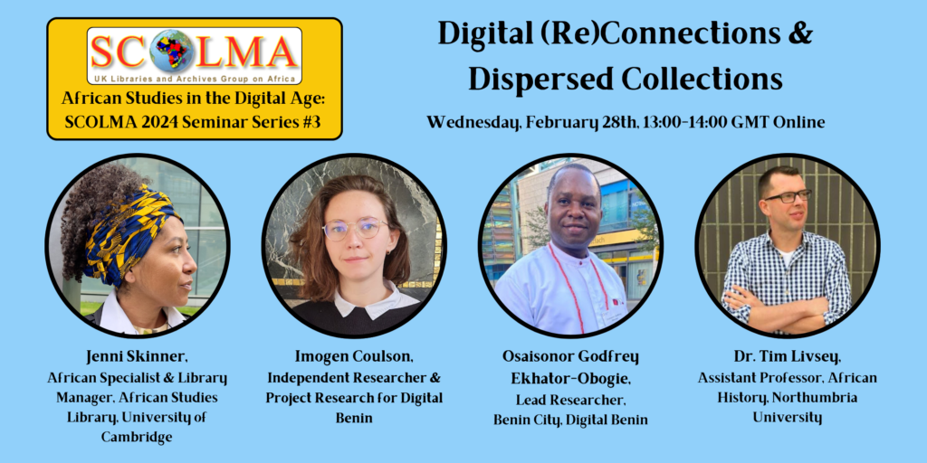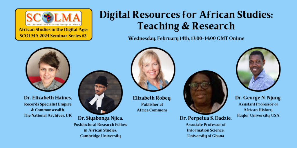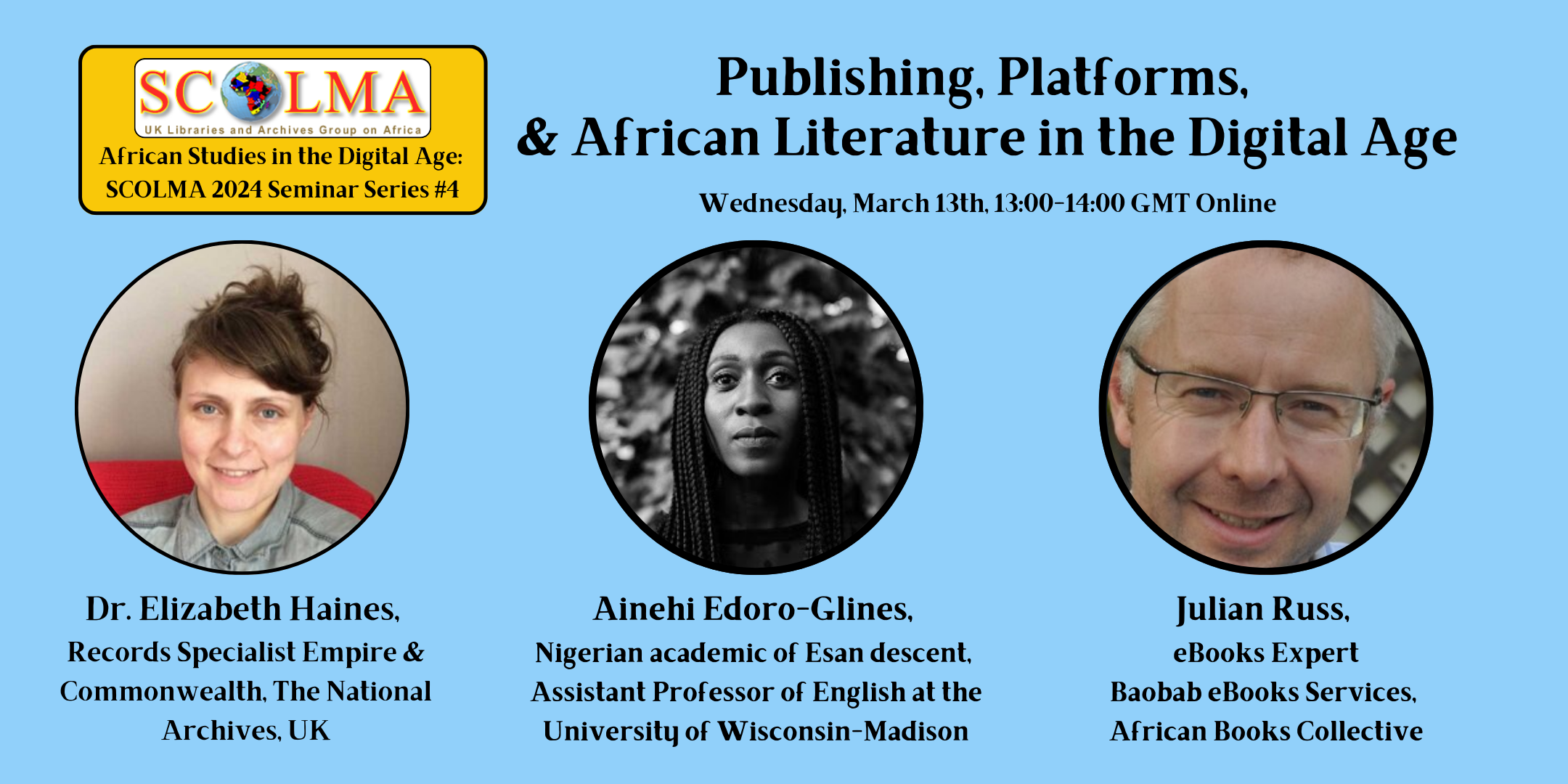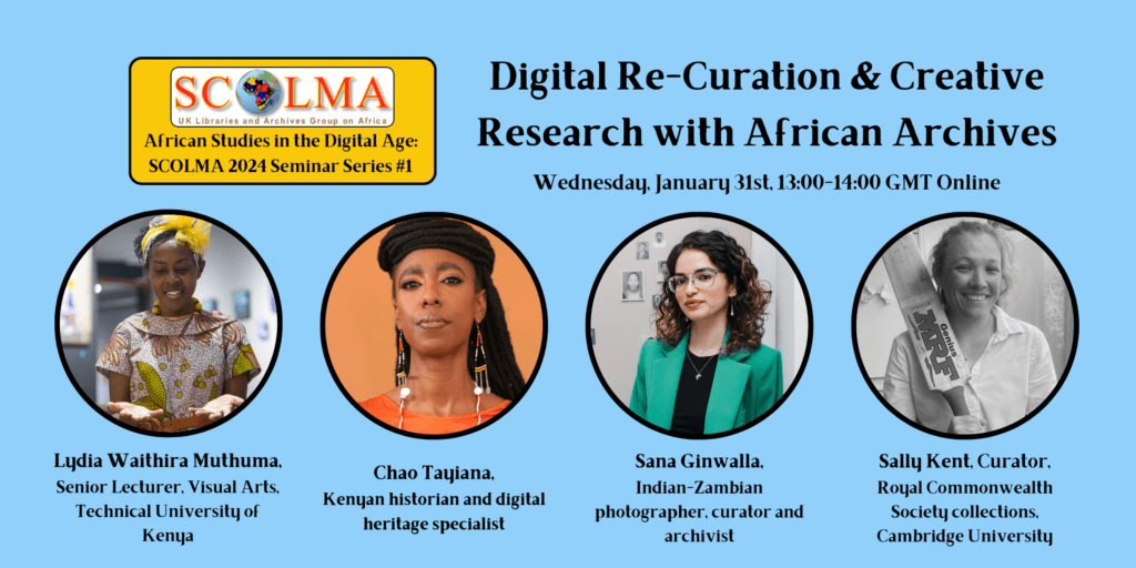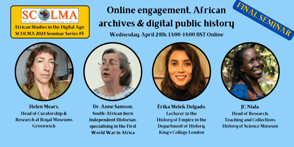 SCOLMA: SCOLMA is the UK Libraries and Archives Group on Africa, a forum that brings together those who work with collections of African Studies materials in libraries and archives in the United Kingdom. This spring we embarked on a new project, an online seminar season. This season had five roundtable sessions exploring the topic ‘African Studies in the Digital Age’.