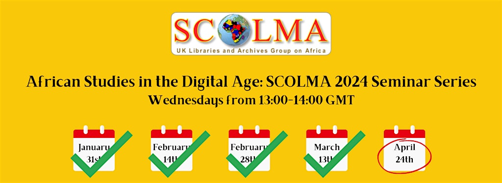 Become a SCOLMA member, get in touch, and follow us: – Twitter (X): Find links to our 2024 Seminar Series videos here and other updates about collections and events related to African Studies in and around the UK – YouTube: The full 2024 Seminar Series videos can be found on our YouTube channel – Eventbrite: Don’t miss a notification about our upcoming events – LinkedIn: Connect with SCOLMA members and those interested in African collections – You can also sign up to our mailing list – And email us: enquires@scolma.org