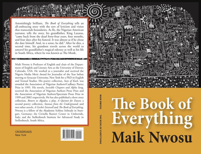 Nwosu: The response to the title of the novel, “The Book of Everything,” has been almost overwhelming – so many questions and comments. I’ve had to explain that the title is not a response to any other writer’s work or a comment on the contemporary state of literature. There were other titles that I considered, but “The Book of Everything” centralizes an idea about a book of everything, which may not actually be a book, which we all have in some form – a human reality or imaginary that, while grounded in a particular experience, also transcends it. It’s not the “ten commandments” or something of that sort, but, as is the story of King Lazarus in The Book of Everything, a way of being in the world that possibly bridges the distance between zero and infinity because it’s ground zero as well as a longing for, or even a pursuit of infinity.